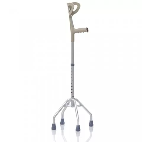 Baston tetrapod reglabil in inaltime pentru adulti cu maner sprijin pe cot, baza larga, realizat din aluminiu anodizat ultrausor, puferele din cauciuc moale il fac sigur in utilizare.