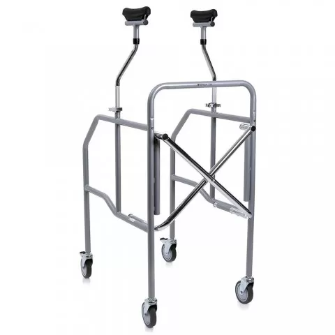 Cadru sprijin subaxilar, pliabil - RP756S Cadru sprijin subrat pliabil, realizat in tubulatura din otel cromat cu 4 roti de 100 mm, cele din spate prevazute cu frana, sprijin subrat captusit, detasabil. Optional poate fi folosit impreuna cu scaunul model RP757. Dimensiuni: Inaltime pana la ...