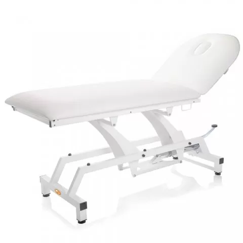 • Canapea hidraulica de consultatie realizata pe structura tubulara din otel vopsit in alb, reglabila pe inaltime hidraulic și spatar ajustabil pneumatic cu inclinare de 60°, saltea din spuma poliuretanica cu densitatea de 25 kg/m3 și inaltime de 8 cm, husa saltea din vinil, material ignifug, ușor de curățat și spalat, pufere din cauciuc pentru a preveni alunecarea.