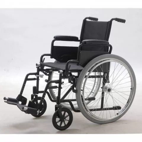 Carucior cu rotile pliabil pentru transport pacienti adulti cu handicap, construit pe cadru din otel vopsit de culoare albastra, disponibil in mai multe variante de sezut: 43 cm si 45 cm; cu antrenare manuala pentru uz exterior; buzunar spate pentru transportul actelor; manere rabatabile pe doua nivele, capitonate cu burete pentru un confort sporit.Sezut si spatar din material sintetic moale de culoare neagra, lavabil. Suport picioare detasabil, cu miscare de rotatie antero-posterioara, reglabil in lungime, cu pedala din plastic si suport calcai tip banda.