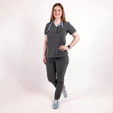 Uniformă medicală concepută pentru un aspect îngrijit și confort în activitatea zilnică, potrivită pentru multiple specializări.