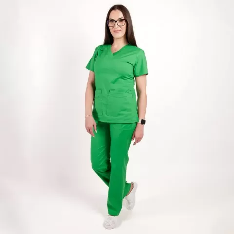 Uniformă medicală concepută pentru un aspect îngrijit și confort în activitatea zilnică, potrivită pentru multiple specializări.
