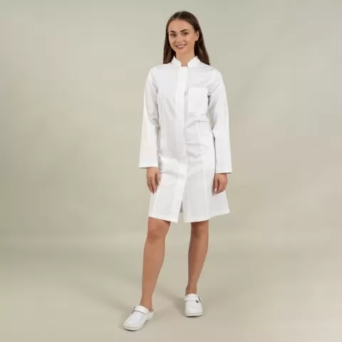 Halat medical alb 3/4 cu guler tunica - Diana Uniformă medicală concepută pentru un aspect îngrijit și confort în activitatea zilnică, potrivită pentru multiple specializări. Halatul medical Diana 3/4, cu capse, este un halat cu un aspect elegant, confort maxim și rezistenta sporita, cu guler tunic...