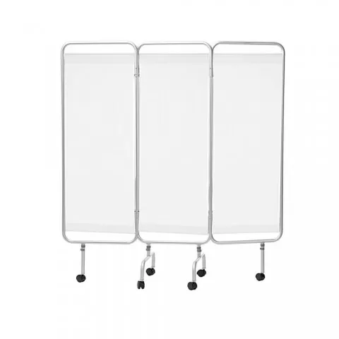 Paravan cu trei segmente pe cadru din aluminiu - MO411A Produs conceput pentru utilizare în medii medicale și de îngrijire, cu accent pe funcționalitate și utilizare practică. Realizat pe structura tubulara din aluminiu. Perdele din plastic cu trei segmente, lavabile, ignifuge. Paravanul este mobil...