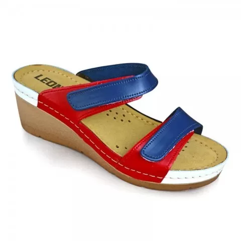 Saboți Leon 1040, de vară, din piele, bleumarin/alb/rosu - saboții de damă Leon sunt potriviți în garderoba feminină. Saboții de vară Leon sunt confecționați din piele naturală 100% atât la interior, cât și la exterior, oferind confort ridicat și menținând picioarele uscate în zilele călduroase. Talpa interioară are gel cu memorie și menține confortul chiar și atunci când petreci multe ore în picioare sau mergi distanțe mari pe jos.
