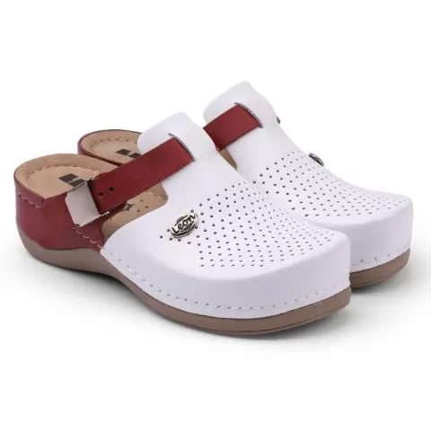 Saboti medicali, de dama, din piele, alb/bordo, Leon 901 | Saboti dama | Incălțăminte și saboți medicali | medicmag.ro