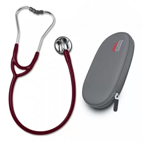 Stetoscop ERKA Sensitive, visiniu, cu borseta ERKA Stetoscop destinat uzului medical, cu construcție practică și manevrare ușoară. Standardul de referinta in auscultare. Combinatia dintre membrana dubla, patentata de ERKA și geometria optima a camerei de sunet permite auscultarea optima atat a tonu...