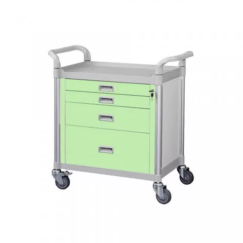Troliu / Carucior medicatie - FC2704L Produs pentru cabinete, clinici sau îngrijire la domiciliu, Troliu cu top din PP ușor de curățat și rezistent, cu 4 sertare pentru medicamente cu incuiere centralizata. Structura din aluminiu este rezistenta la coroziune, lavabila, ușor de curățat și dezinfect...