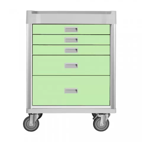 Troliu urgente 5 sertare - MX31EMG Soluție potrivită pentru dotări medicale, realizată pentru manevrare ușoară și utilizare constantă, Troliu multifunctional cu structura metalica, top și masuta din ABS, prevazut cu 5 sertare de 3 marimi pe un singur rand, sertarele fiind culisante pe role (pentru...